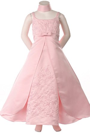 A Line and empire waistline dresses are flattering flower girl styles. Sizes: 4,6,8,10
