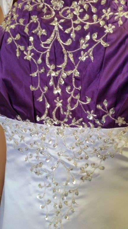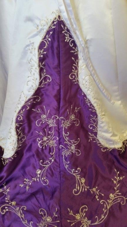 Custom made without the sleeves. Shown in White with Royal Blue Satin |