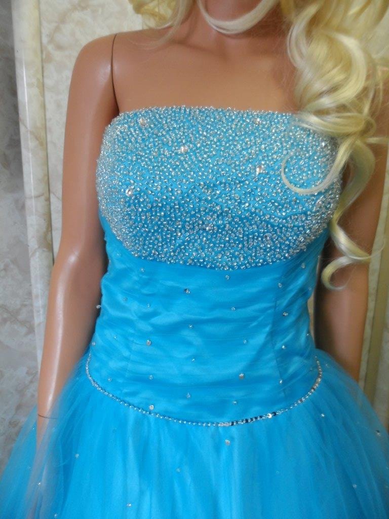 | strapless ruched ball gown | Blue strapless ruched bodice with beaded applique. | blue prom dress with sheer jacket | |||||