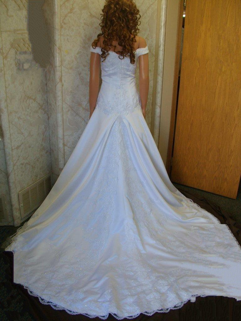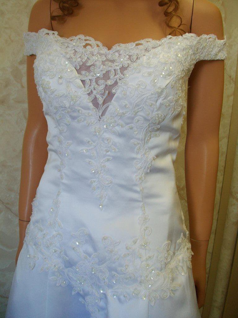 white off shoulder wedding gown white satin clear, and white beading size 10 |