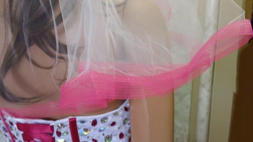 veil to match in the white with the pink horsehair 1" edging in the same pink to match on a comb |